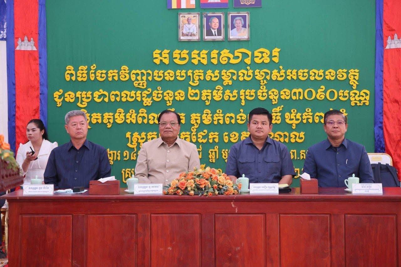 វិញ្ញាបនបត្រសម្គាល់ម្ចាស់អចលនវត្ថុចំនួន ៣,០៩០ បណ្ណ ត្រូវបានប្រគល់ជូនប្រជាពលរដ្ឋក្នុងភូមិអំពិលទឹក និងភូមិកំពង់ពោធិ៍ ឃុំកំពង់ភ្នំ ស្រុកលើកដែក ខេត្តកណ្ដាលពិធីនេះប្រព្រឹត្តទៅក្រោមអធិបតីភាព ឯកឧត្តម ឈឿន ប៊ុណ្ណារ័ត្ន រដ្ឋលេខាធិការ ក្រសួងរៀបចំដែនដី នគរូបនីយកម្ម និងសំណង់ ឯកឧត្តម នូ សាខន ប្រធានក្រុមប្រឹក្សាខេត្តកណ្តាល និងឯកឧត្តម គួច ចំរើន អភិបាលនៃគណៈអភិបាលខេត្តកណ្តាល។ក្នុងពិធីនេះ មានការចូលរួមពីប្រធានមន្ទីរ អង្គភាពជុំវិញខេត្ត អាជ្ញាធរមូលដ្ឋាន និងបងប្អូនប្រជាពលរដ្ឋសរុបចំនួន ៦៧០នាក់ ក្នុងនោះស្ត្រី ៤៥០នាក់។ថ្ងៃទី២១ ខែតុលា ឆ្នាំ២០២៥