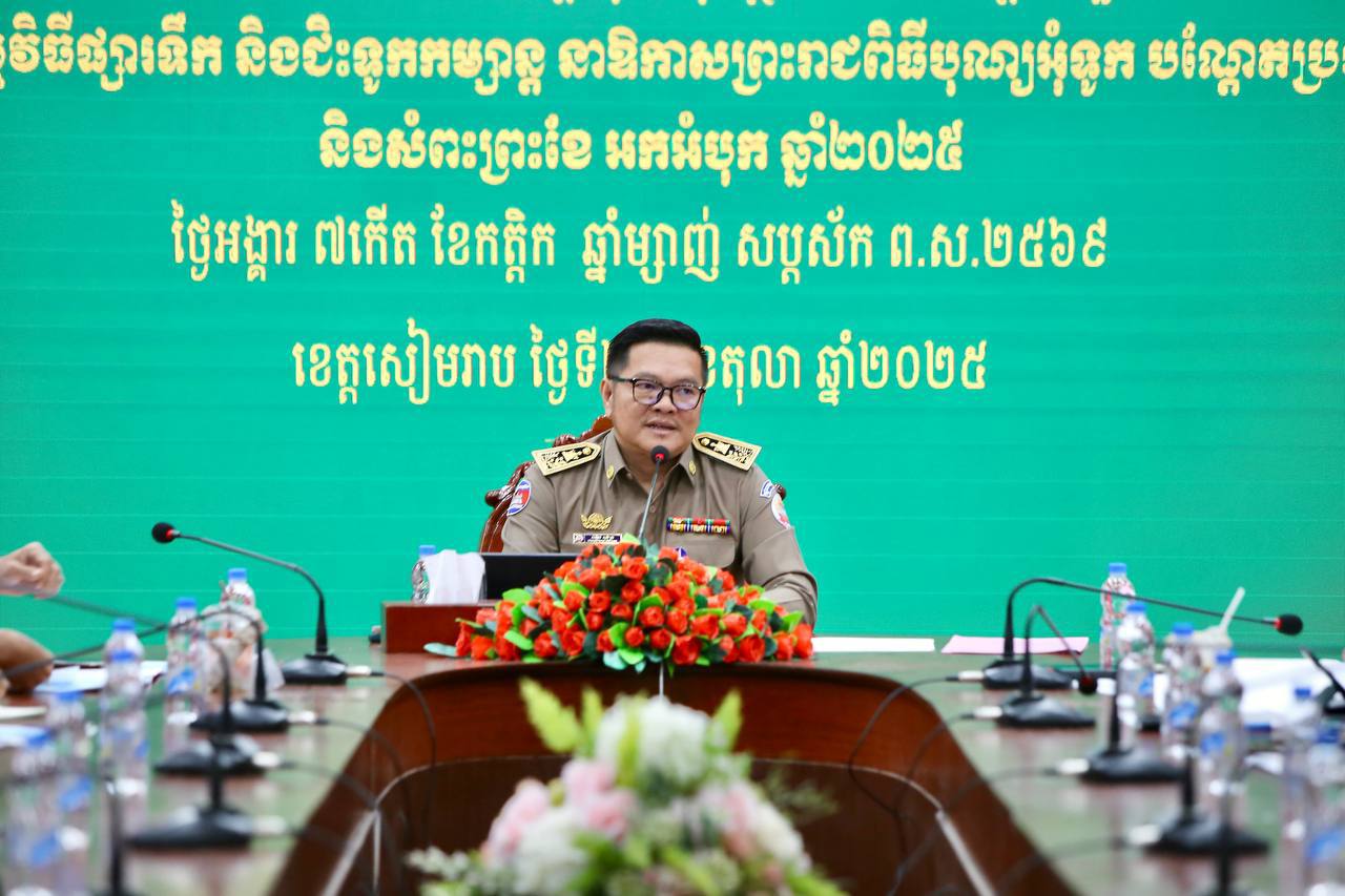 នាព្រឹកថ្ងៃទី២៨ ខែតុលា ឆ្នាំ២០២៥ នៅសាលប្រជុំសាលាខេត្តសៀមរាប លោកឧត្តមសេនីយ៍ត្រី សៀ ទីន មេបញ្ជាការ កងរាជអាវុធហត្ថខេត្តសៀមរាប បានដឹកនាំកម្លាំងអញ្ជើញចូលរួមកិច្ចប្រជុំផែនការការពារ ធានាសន្តិសុខ សុវត្ថិភាព និងសណ្តាប់ធ្នាប់កម្មវិធី ផ្សារទឹកនិងជិះទូកកំសាន្តនាឱកាសព្រះរាជពិធីបុណ្យអុំទូក បណ្តែតប្រទីប និងសំពះព្រះខែ អកអំបុក ឆ្នាំ២០២៥ ក្រោមអធិបតីភាពលោក សំកុល សុចិត្រា អភិបាលរងតំណាង ឯកឧត្តម ប្រាក់ សោភ័ណ អភិបាល នៃគណៈអភិបាលខេត្តសៀមរាប។