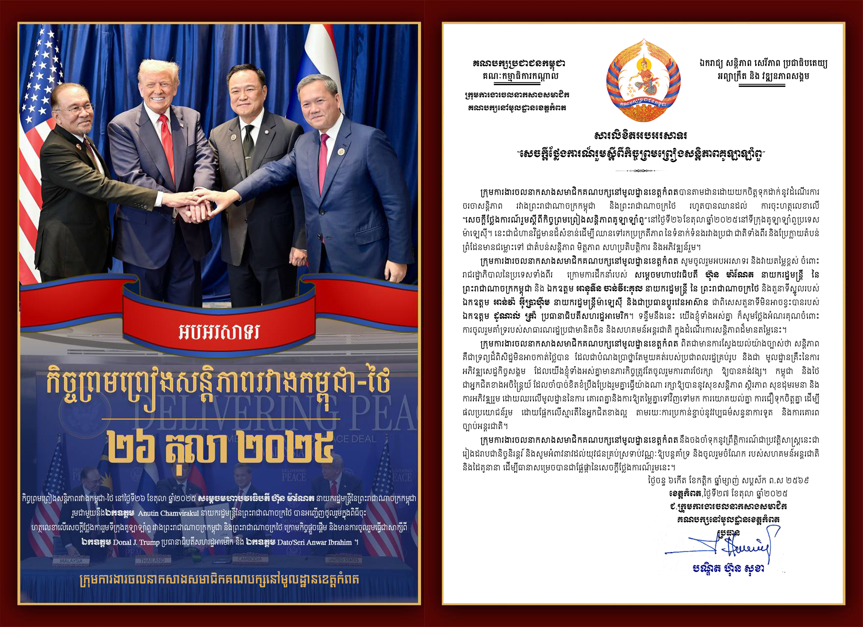 ក្រុមការងារចលនាកសាងសមាជិកគណបក្សនៅមូលដ្ឋានខេត្តកំពត ចេញសារលិខិតអបអរសាទរ គាំទ្រពេញទំហឹងចំពោះ "សេចក្តីថ្លែងការណ៍រួមស្តីពីកិច្ចព្រមព្រៀងសន្តិភាពគូឡាឡាំពួ" របស់កម្ពុជា-ថៃ ដែលចុះហត្ថលេខាដោយ សម្តេចមហាបវរធិបតី ហ៊ុន ម៉ាណែត នាយករដ្ឋមន្ត្រី នៃព្រះរាជាណាចក្រកម្ពុជា និងឯកឧត្តម អានុទីន ចាន់វីរៈគុល នាយករដ្ឋមន្ត្រី នៃព្រះរាជាណាចក្រថៃ ដោយមាន ឯកឧត្តម ដាតុ ស្រ៊ី អាន់វ៉ា អ៊ីប្រាហ៊ីម នាយករដ្ឋមន្ត្រីម៉ាឡេស៊ី និងជាប្រធានប្តូរវេនអាស៊ាន និង ឯកឧត្តម ដូណាល់ ជេ. ត្រាំ ប្រធានាធិបតីសហរដ្ឋអាមេរិក ធ្វើជាសាក្សីនៅទីក្រុងគូឡាឡាំពួ ប្រទេសម៉ាឡេស៊ី នាថ្ងៃទី២៦ ខែតុលា ឆ្នាំ២០២៥ ។